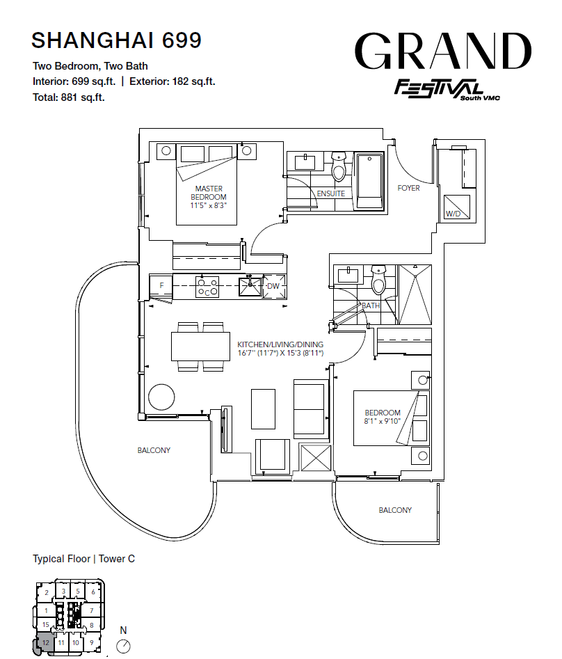 Brand New Building (going through final construction stages) – 2 Bedroom 2 Bathroom, facing Southwest. Open concept kitchen living room – 699sq.ft., ensuite laundry, stainless steel kitchen appliances included. Engineered hardwood floors, stone counter tops.